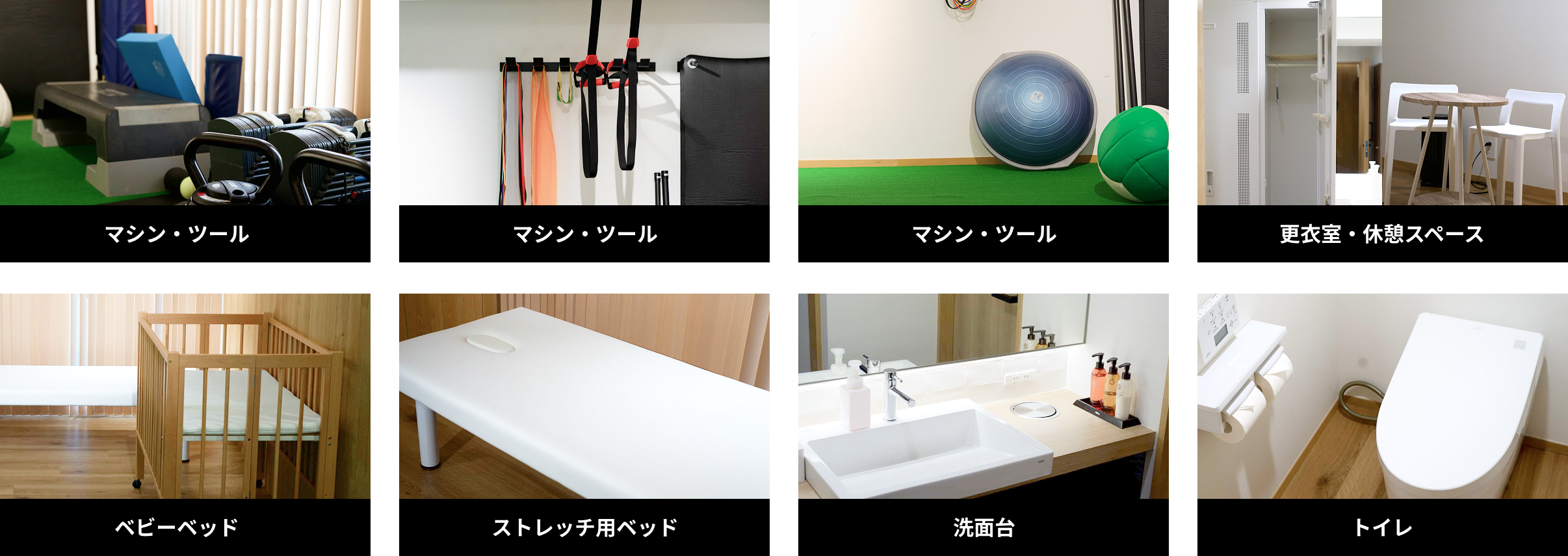 ジムにはベビーベッドも完備しておりますので、⼩さなお⼦様と⼀緒の空間でトレーニ
